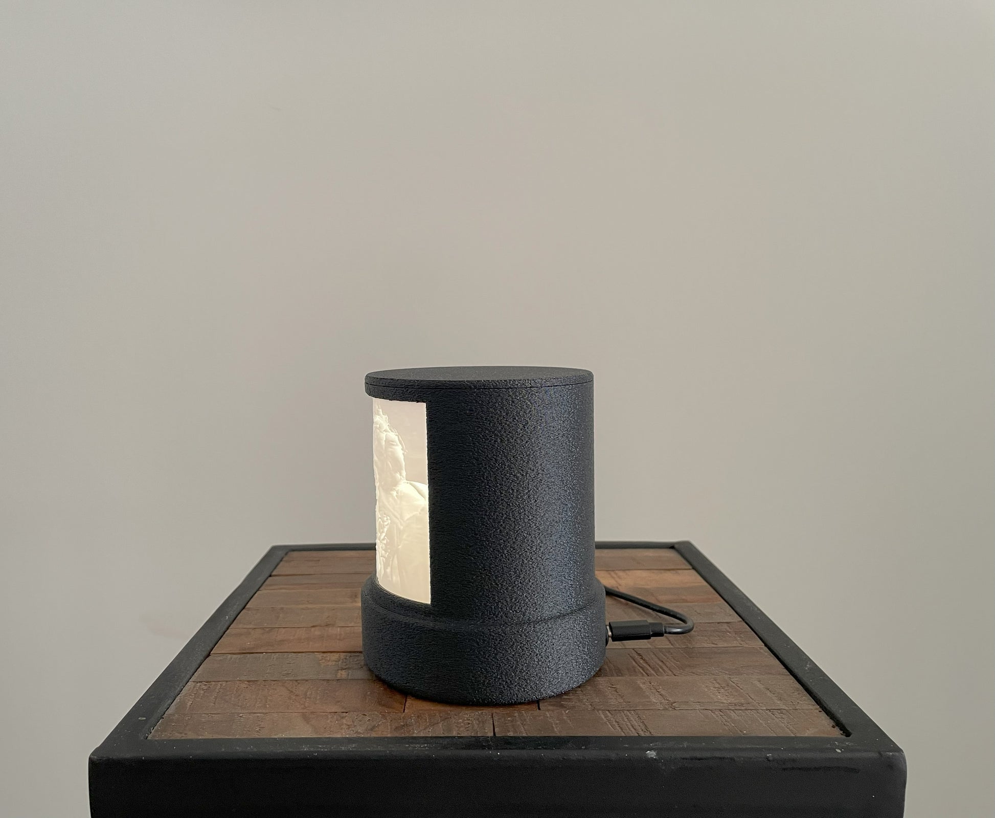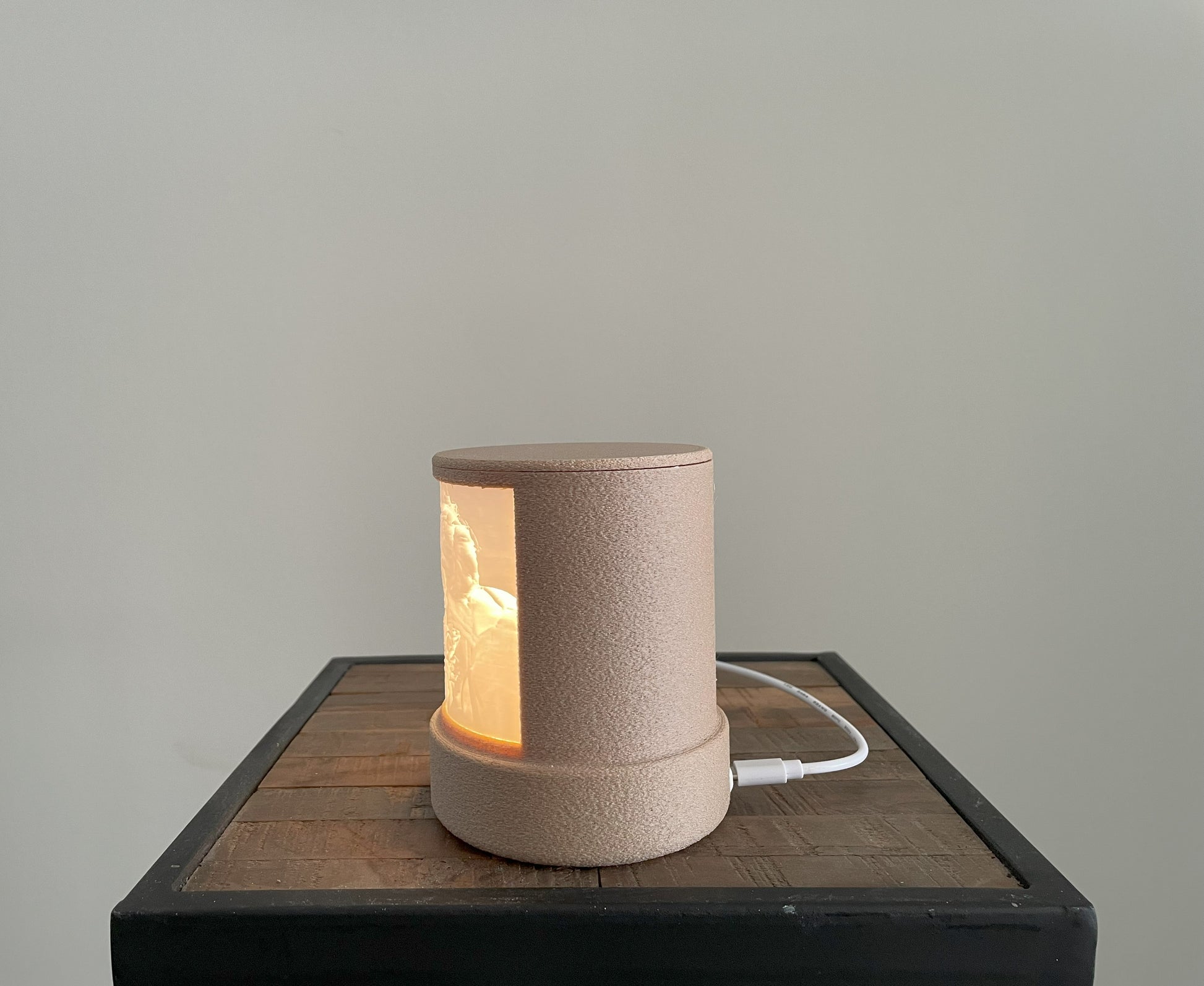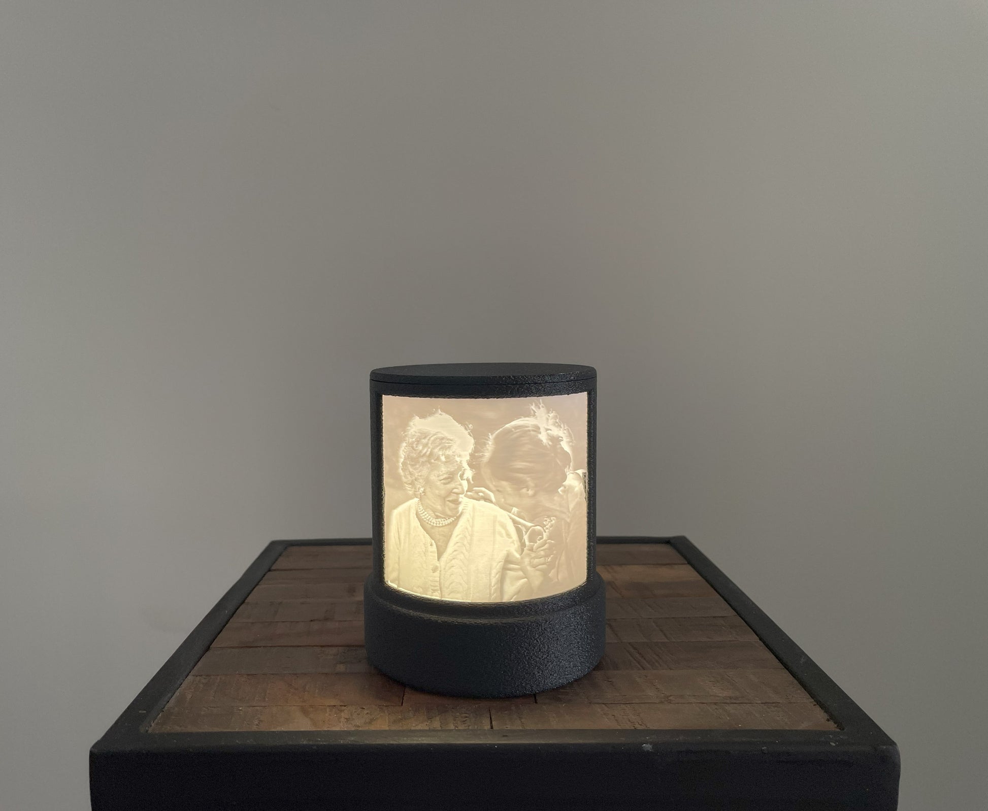 Een 3D-geprint herinneringslicht met verborgen opbergruimte. Dit lichtobject verlicht een foto in een cilindervormige lithophane en biedt tegelijk een veilige plek voor kleine waardevolle items, zoals sieraden, as of symbolische voorwerpen. Het ontwerp maakt het mogelijk om de foto eenvoudig te wisselen: je kunt later extra cilinders bestellen zonder een compleet nieuwe lamp nodig te hebben.